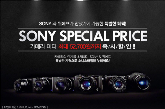 소셜커머스 위메프(대표 박은상 www.wemakeprice.com) 는 소니코리아와 손잡고 12월9일까지 즉시할인 'SPECIAL PRICE'기획전을 진행한다고 밝혔다.
