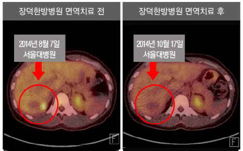 8월에 내원한 박지은씨는 항암치료와 면역치료를 병행하여 올해 10월 PET CT 검사에서 간으로 전이된 종양이 소실된 것으로 진단 받았다. 한편, "박지은씨가 올해 치료 받은 항암제는 작년에도 사용한 탁셀이라는 항암제로 이미 내성이 생긴 항암제여서 항암제만으로는 효과가 거의 없을 것으로 예상하였지만 면역치료와 병행하여 좋은 결과가 생겼다"고 전했다.