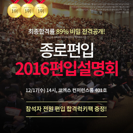 편입 명문 종로편입학원(www.JRjump.co.kr)이 12월 17일 오후 2시에 코엑스 컨퍼런스룸에서 '2016년 편입 성공전략 설명회'를 개최한다.