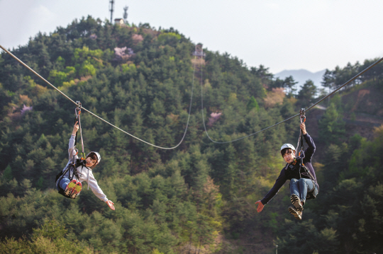 특히 송이밸리 자연휴양림의 울창한 숲과 동해바다를 조망할 수 있는 짚라인은 최고의 인기 코스다. 580m 비거리가 짜릿한 스릴감을 맛보게 한다.