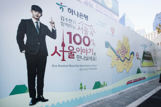 하나은행은 도시미관을 아름답게 하기 위해 설치한 철거 가림막을 마치 거대한 책을 층층이 쌓아 올린 모습으로 만들었다. 각각의 책은 서울의 대표명소를 소개하는 형태로 만들어진 것이 특징이다.
