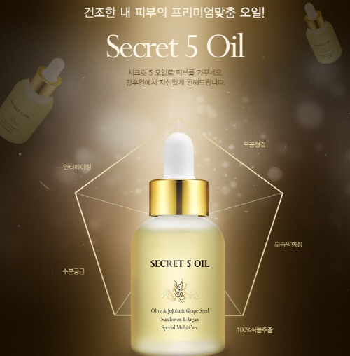 '시크릿5 오일'(Secrit 5 Oil)은 모든 피부타입에 맞추어 지속력이 높은 완벽한 피부보습을 도와주며, 집중적으로 영양공급을 해주는 천연 식물성 오일이 100% 함유된 제품이다.