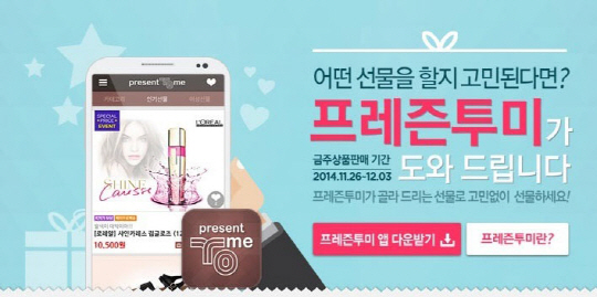 프레즌투미 이효영MD는 "간단히 위시 버튼만 눌러 인기 상품을 최저가에 구매할 수 있는 이벤트로 가까운 시일 내에 2차 상품도 선보일 예정"이라며 "직접 선물 전달이 힘든 지인의 위시리스트를 파악해 선물이 가능하고 부담스러운 금액은 1/N로 나눠 결제할 수도 있어 연말 선물 시 활용도가 높다"고 말했다.