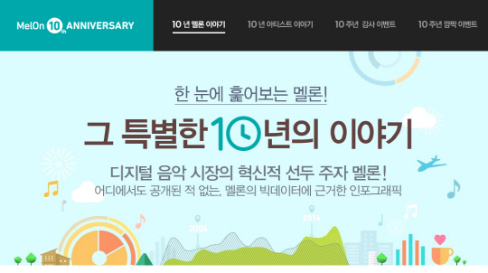 한편, 멜론은 서비스 10주년을 맞아 고객들로부터 그동안 받아온 큰 사랑과 성원에 보답하기 위해 오는 12월 14일까지 '멜론 10주년 감사 이벤트'를 진행한다.