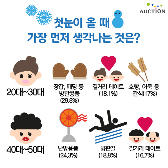 옥션(www.auction.co.kr)이 지난 11월 17일부터 30일까지 회원 총 1,276명을 대상으로 '첫눈과 겨울 준비'를 주제로 설문조사를 진행한 결과, 눈이 오면 20~30대는 '방한 의류 및 잡화'를, 40~50대는 '난방용품'을 가장 먼저 떠올리는 것으로 나타났다.