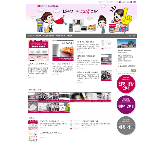 또한 베스트샵 내 베스트 매니저가 직접 가전제품 관리나 구매 팁 등을 알려줘 소비자들에게 유용한 생활정보를 지속적으로 전달할 예정이다. 이외에도 'LG전자 베스트샵 스토리'에서는 베스트샵에서 진행되는 모든 판촉이벤트 및 행사를 가장 빠르게 확인할 수 있다.