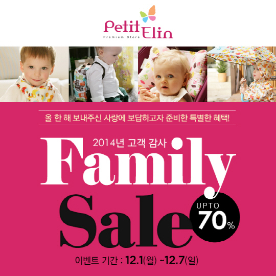 프리미엄 유아용품 전문기업 쁘띠엘린㈜(대표 이남진, www.petitelin.com)이 7일까지 2014년 고객 감사 패밀리 세일을 시작한다.