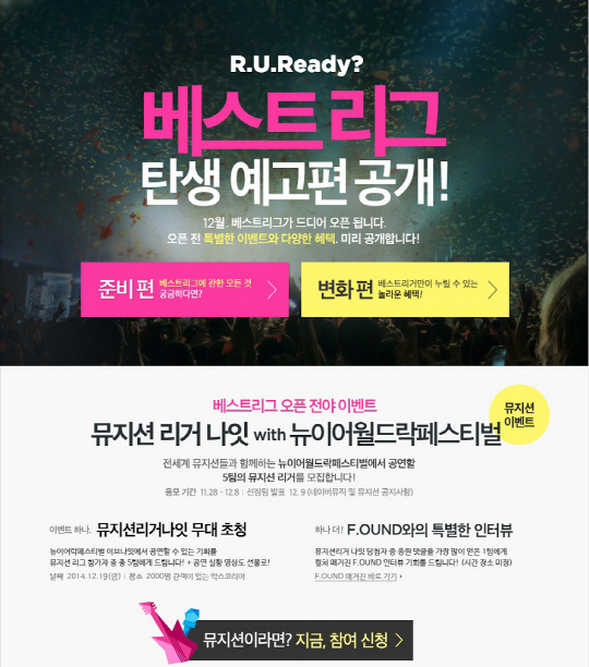 네이버(대표 이사 김상헌)는 12월 19일에 개최되는 '뉴이어 월드 락 페스티벌' 전야제에 뮤지션리그 참가자의 공연을 직접 볼 수 있는 '뮤지션리거나잇' 무대를 개최한다.