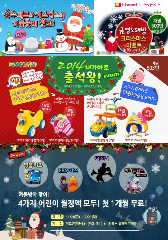 어린이들을 위한 크리스마스 선물로 12월 31일까지 키즈 전용 데이터방송서비스인 '뽀로로 재능놀이(503번)', '키즈북(507번)', '아이코북(504번)'은 다양한 경품 이벤트를 진행하는 동시에 신규가입고객 전원에게는 가입한 바로 다음날 3천원 VOD쿠폰을 선물한다. '뽀로로 재능놀이 출석왕 이벤트'는 뽀로로 붕붕카 등 캐릭터 상품을 추첨을 통해 총 50명에게 선물하고, '키즈북 겨울맞이 이벤트'는 전 가입자 대상으로 추첨을 통해 온수매트와 사운드 북을 증정할 예정이다. 엄마 아빠가 읽어주는 TV동화책 서비스인 아이코북은 12월 15일부터 28일까지 약 2주간 '겨울맞이 이벤트'에 참여한 고객들을 대상으로 추첨을 통해 아이패드 에어(32G), 가습기, USB 손난로를 증정한다.