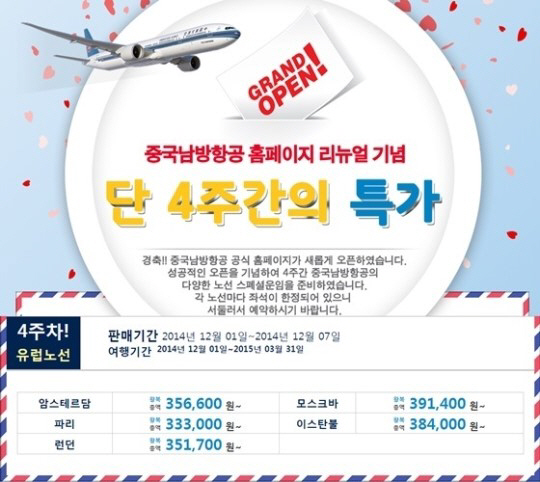 중국남방항공사는 홈페이지 리뉴얼 기념으로 1일부터 오는 7일까지 유럽노선 프로모션 행사를 진행한다. 파격적인 유럽노선 프로모션은 유류할증료를 포함해 파리, 암스테르담, 모스크바행 등을 30만원대에 판매한다.