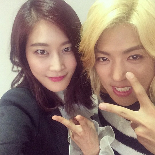 사진 속 이현이와 강남은 손으로 브이(V)를 그리며 카메라를 응시한 채 밝은 표정을 짓고 있다.