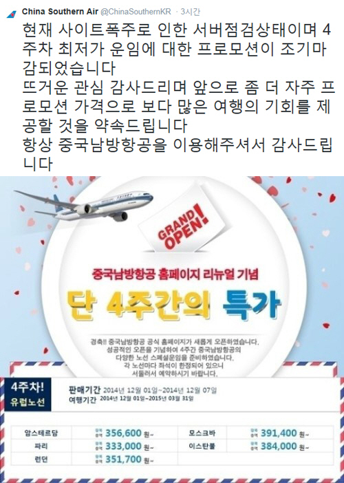 이어 "뜨거운 관심 감사드리며, 앞으로 좀 더 자주 프로모션 가격으로 보다 많은 여행의 기회를 제공할 것을 약속드립니다. 항상 중국남방항공을 이용해 주셔서 감사드립니다"라고 전했다.