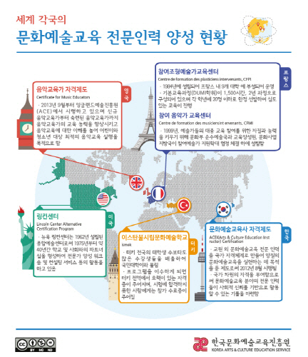 '문화예술교육사'란 교원 외 문화예술교육 전문 인력을 국가 자격체계로 만들어 양질의 문화예술교육을 실현하는 데 목적을 둔 제도로서 2012년 8월 시행됐다. 예술 기반의 인력이 교수역량 및 기획, 분석, 평가 등 역량을 갖추어 예술교육가로 역량을 갖추도록 자격요건과 교육과정을 명시하고 있다. 공예, 국악, 디자인, 만화·애니, 무용, 미술, 사진, 연극, 음악, 영화 10개 분야로 구성돼 다른 나라의 자격제도와 달리 폭넓은 분야에서 인력을 양성하고 있다. 등급은 1급과 2급으로 교육과정을 차별화해 경력별 전문성을 높였다. 문화예술교육사 자격제도는 국가주도의 인력양성을 다원화해 대학 및 전문 교육기관에서 인력을 양성할 수 있도록 했다는 점에서 의의가 있다.