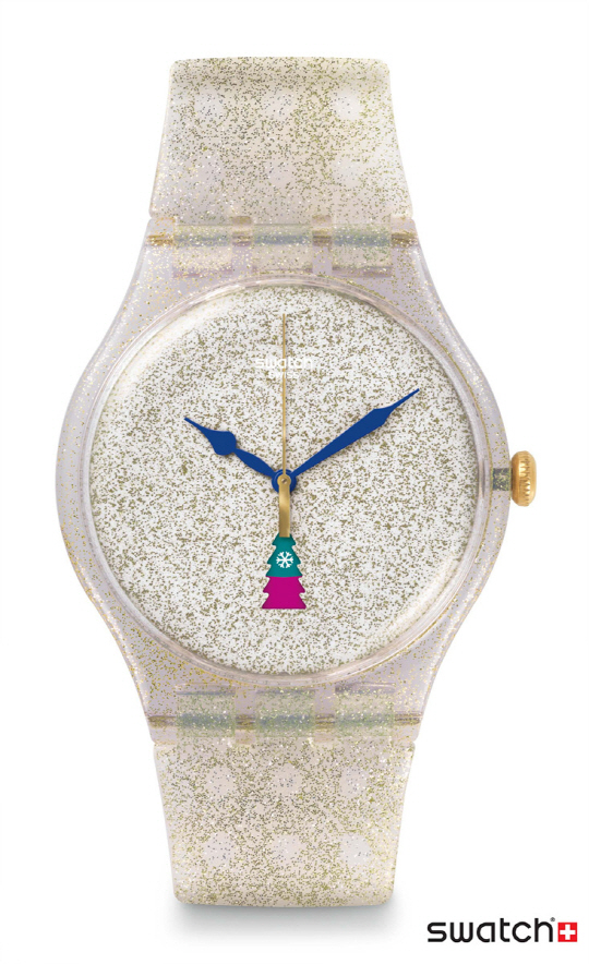 스와치 홀리데이 트위스트는 스와치 인기 모델인 뉴젠트(New Gent) 제품으로 투명한 다이얼과 화이트 스트랩 위에 설원의 반짝이는 눈처럼 표현된 '골드 글리터링'을 더했다. 다이얼 안의 날짜 창이 요일 별로 컬러가 바뀌는 크리스마스 트리 모양이라 재미까지 더했다. 화려하고 로맨틱한 디자인이 캐주얼한 파티 분위기와 잘 어울린다. 따뜻하고 포근한 노르딕 니트 같은 클래식한 겨울철 아이템과 스타일링하기에도 좋다.