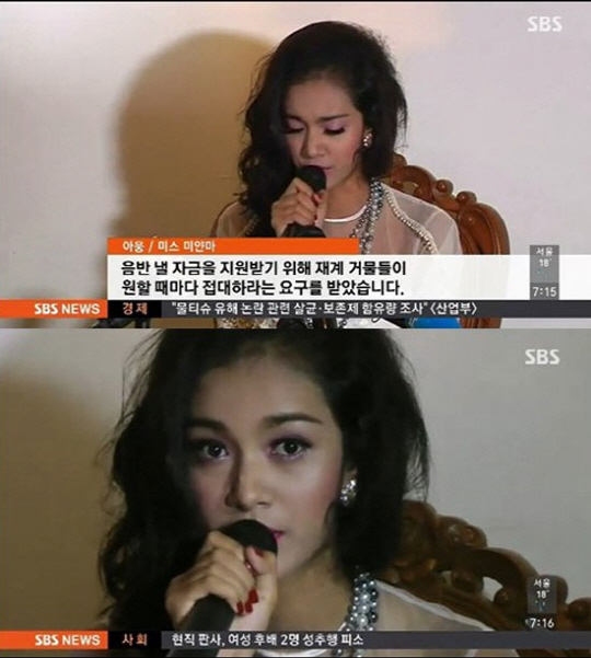 이어 미스 미얀마 아웅은 "돈이 없으니 그들이 원할 때 언제든지 거물급 재계 인사를 접대할 것을 요구했다"고 폭로했다.