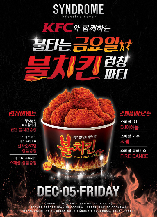 KFC(http://www.kfckorea.com)는 신제품 '불치킨'의 출시일인 12월 5일, 클럽 파티를 접목한 '불치킨 런칭파티'를 연다.