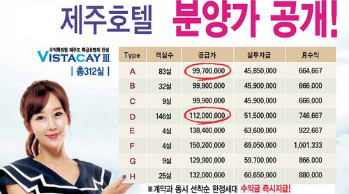 제주비스타케이 모델하우스 분양관계자는 "실투자금대비 5년간 연16% 확정수익을 보장하며, 5년 후 연14%+운영수익 추가 지급한다. 실투자금은 3,500만~5,000만원 소액투자이기 때문에 분양문의가 많다. 분양가격은1억~1억4천대이며 계약금 10%, 중도금60%(전액무이자), 잔금30%(준공시 2016,9) 준공 후 융자이자 연5% 10년간 이자지원 등 다양한 금융 혜택을 준다. 또 10년간 확정수익 보장과 호텔수익률에 따라 또 수익금을 추가지급한다. 혜택으로는 1년에14일을 전세계 100여개국 4,500개호텔 무료로 이용 가능하다. 또한 분양자들에게 높은 수익 이외에 다양한 부가 혜택을 제공해 많은 고객들이 방문하고 있는 실정이다" 라고 전했다.