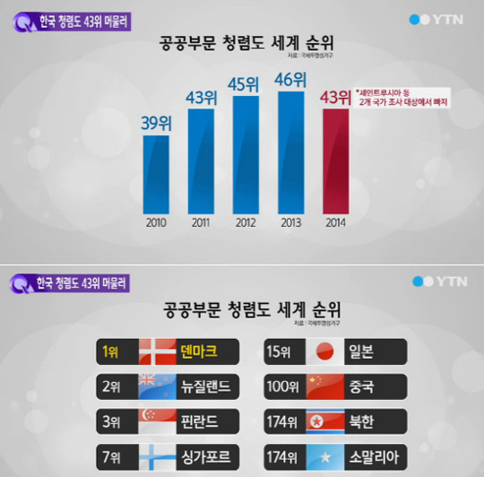 3일 국제투명성기구가 2014년 국가별 부패인식지수(CPI)를 발표한 결과에 따르면 한국은 100점 만점에 55점을 받아 175개국 중 43위를 기록했다.