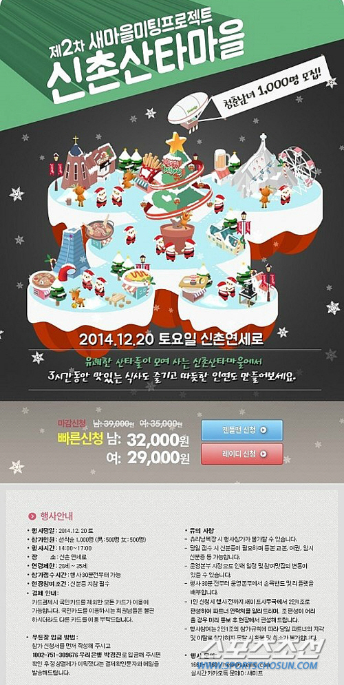 새마을미팅프로젝트의 신촌 솔로대첩 이벤트 참여 가격은 남자 32,000원, 여자 29,000원이다. 카드 결제는 국민카드를 제외한 모든 카드로 결제할 수 있다. 행사 시간은 오는 20일 오후 2시부터 5시까지이며 20살부터 35살까지만 참여 가능하다. 참여시 트레이닝복을 입을 수 없으며 신분증은 필수이다.