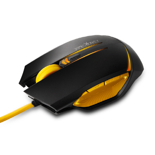 '제임스 동키(JAMES DONKEY) 112' 마우스는 화이트색상과 블랙색상을 바탕으로 노란색 그립과 노란색 휠로 포인트를 주었고, 오렌지 색상의 LED로 화려함을 가미했다.