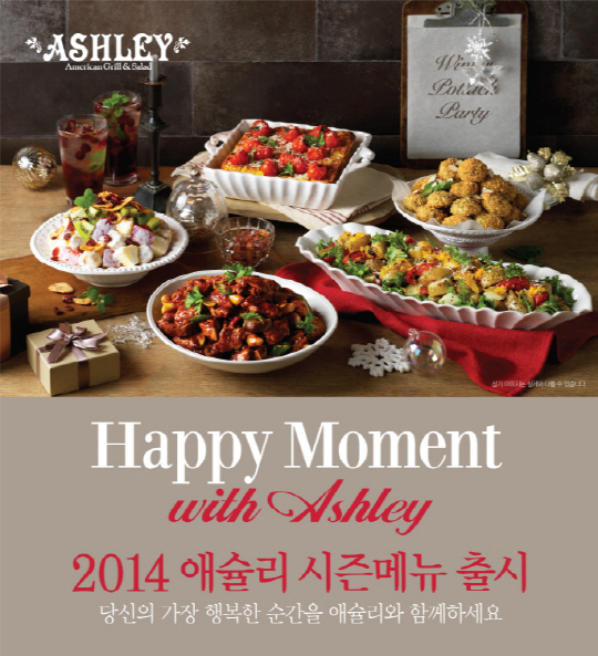 아메리칸 그릴 & 샐러드 애슐리는 2014년 겨울을 맞아 가족, 친구, 연인과 함께 다양한 메뉴를 더욱 풍성하게즐길 수 있도록 '해피 모먼트 위드 애슐리(Happy Moment with Ashley)'라는 콘셉트의 겨울 신메뉴를 새롭게 선보인다.