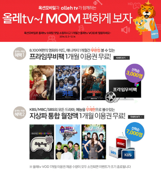 옥션은 유아용품 추천코너인 베이비플러스 '슈퍼맘 핫딜' 상품 구매 고객 중 이벤트 응모자 총 선착순 1만명에게 '올레tv 프라임무비팩 1개월 이용권'과 '지상파 통합 월정액 1개월 이용권'을 제공한다. '올레tv 슈퍼맘 핫딜' 전용상품을 5만원 이상 구매한 뒤, '올레tv VOD 혜택' 중 하나를 선택한 후 응모하면 된다. 올레tv VOD 혜택으로는 '지상파 월정액 1개월 이용권(7천명)'과 ' 올레tv 프라임무비팩 1개월 이용권(3천명)'이 마련되어 있다. 옥션 슈퍼맘 핫딜은 매주 인기 기저귀, 분유, 이유식, 장난감을 특가에 판매하는 코너로, 5일 현재 '하기스 소프트드라이(4팩, 5만1900원)', '남양 임페리얼 분유(800gX3, 5만9900원)', '요미요미 유기농 주스(12팩, 9900원)' 등을 국내 최저가로 판매한다. 더불어 신규회원 할인쿠폰과 베이비플러스 전용쿠폰, 모바일 할인쿠폰 등 각종 쿠폰혜택도 제공한다.