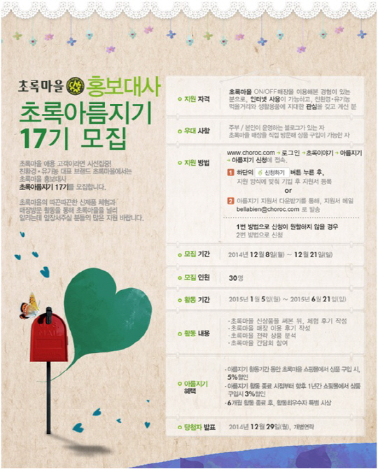 친환경 유기농 브랜드 초록마을(대표이사 박용주, www.choroc.com)이 오는 21일(일)까지 브랜드 홍보대사 '초록아름지기 17기'를 모집한다.