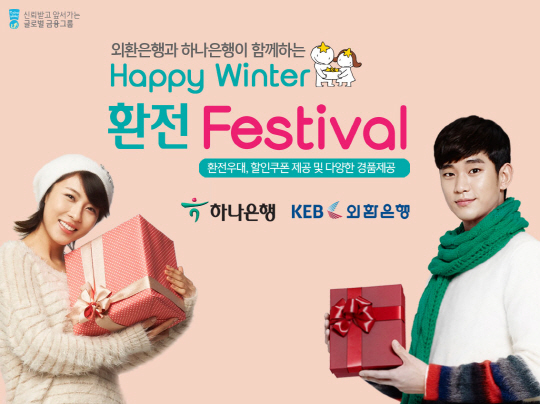 하나금융그룹(회장 김정태)은 하나은행(은행장 직무대행 김병호)과 외환은행(은행장 김한조)이 공동으로 겨울 여행 성수기를 맞아 가족, 단체 해외여행객 및 유학, 어학연수, 배낭여행을 떠나는 학생 고객들을 대상으로 8일부터 내년 2월 말까지 'Happy Winter 환전 페스티벌' 을 실시한다고 밝혔다.