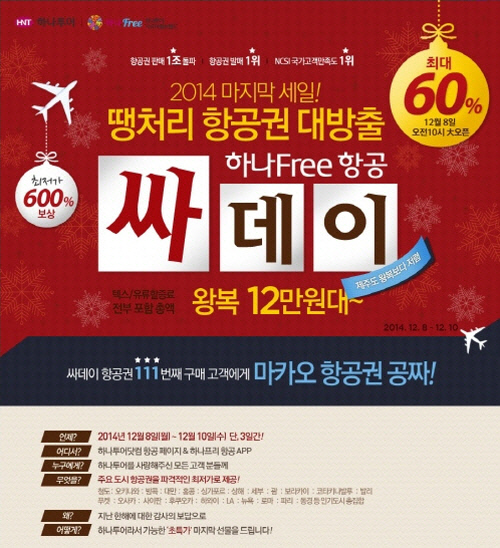 하나투어가 2014년 마지막 감사 세일의 일환으로 '땡처리 항공권 대 방출 싸데이 이벤트'를 마련한다.