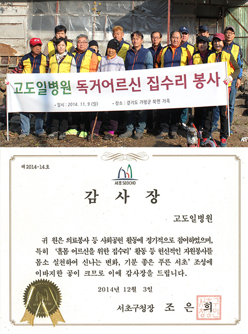 이러한 진정성 덕분인지, 고도일병원이 의료봉사 등 사회공헌 활동에 정기적으로 실천한 것에 대해 최근 서울시 서초구청은 고도일병원에 감사장을 수여했다. 고도일병원이 의료봉사 등 사회공헌 활동에 정기적으로 참여하며 헌신적인 자원봉사를 몸소 실천했다는 것이다. 지역사회 발전 및 구민 복리 증진에도 앞장서는 고도일병원이 자치단체로부터 감사장을 받는 등 사회공헌에서도 두드러진 성과를 나타내고 있다.