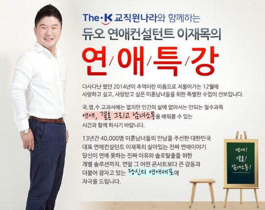 결혼정보회사 듀오(대표 박수경)가 'The-K 교직원나라'와 함께 14일 강남에 위치한 듀오 본사 16층에서 미혼남녀 60명을 대상으로 연애특강을 진행한다.