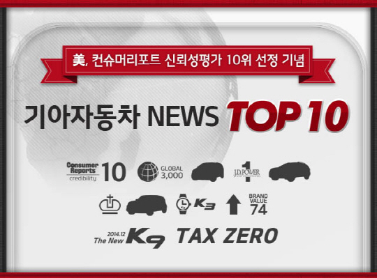 한편 기아차는 2014년 기아차 10대 뉴스로 ▲기아차, 美 컨슈머 리포트 선정 '신뢰성 있는 자동차 회사 10위' ▲기아차, 글로벌 누적판매 3천만대 돌파 ▲2014 국내 최다판매 모닝(1~11월 기준, 상용제외) ▲K7, J.D.POWER 신차품질조사 1위 ▲교황이 선택한 포프모빌! 올 뉴 쏘울 ▲RV 왕의귀환 카니발, 쏘렌토 출시 ▲스마트키 탑재한 'K3 워치' 인기 ▲기아차, 브랜드가치 74위 '순위 상승폭 업계 최고' ▲더 뉴 K9 출시 ▲12월 고객감사 마지막 특별 구매혜택 등을 선정했다.