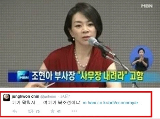 진중권 교수는 9일 자신의 트위터에 대한항공의 공식 사과문과 관련한 기사 링크를 걸고 "기가 막혀서. 여기가 북조선이냐"라는 짧은 글로 불쾌감을 표출했다.