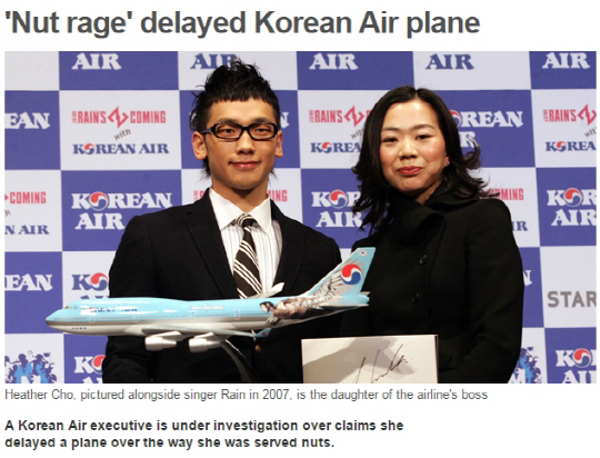 이 비행기 일등석에 타고 있던 조현아 부사장이 땅콩 등 견과류 서비스 제공을 매뉴얼대로하지 않았다는 이유로 책임자인 사무장을 내리도록 지시했다.