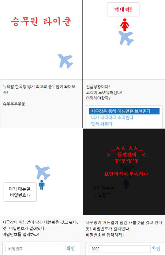 해당 게임을 실행하면 '뉴욕발 한국행 비행기 최고의 승무원이 되어보자. 비행기가 활주로를 달리기 시작했다. 가볍게 즐길 수 있는 간식으로 무엇이 좋을까?'라는 질문이 등장한다.
