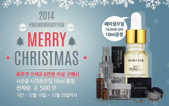 ㈜황후연 공식쇼핑몰 (www.hwangwhooyeon.com) 에서 12월 크리스마스를 맞이하면서 평소 황후연에 관심이 많았던 고객들의 성원에 보답하기 위해 12월 10~25일까지 증정이벤트를 진행한다.
