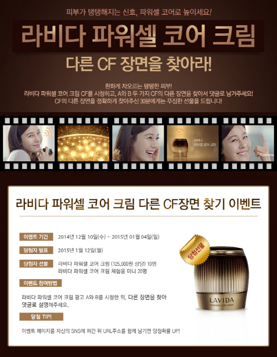코리아나화장품(대표이사 유학수) 대표브랜드 라비다에서 피부코어 힘을 강화시켜 탄력 있고 건강한 피부로 가꾸어 주는 '라비다 파워셀 코어 크림'의 TV광고가 유투브 30만뷰를 달성, 이를 기념 하는 이벤트를 12월 10일부터 1월 4일까지 진행한다.