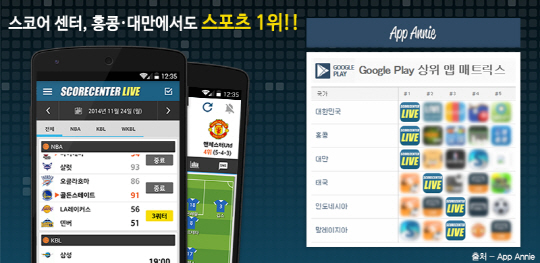 최근 앱 통계 사이트 '앱 애니(App Annie)'에 따르면 국내 스포츠 부문 부동의 1위인 종합스포츠앱 스코어센터가 태국(2위), 인도네시아(3위), 말레이시아(3위) 등 동남아시아를 휩쓴 데 이어 홍콩과 대만에서도 1위에 오르며 중화권에서도 큰 사랑을 받고 있다.