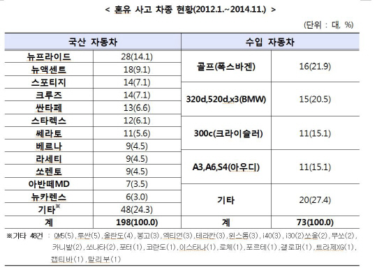 2012년부터 올해까지 총 384건의 상담 가운데 피해 차량이 확인된 271건을 분석한 결과 국산 자동차가 198건(73.1%)이고, 수입 자동차는 73건(26.9%)이었다.