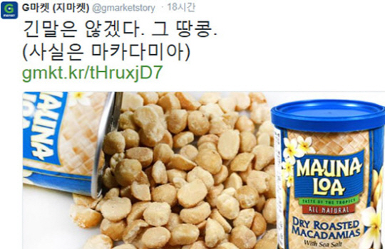 9일 온라인 쇼핑몰 지마켓은 트위터에는 "긴 말은 않겠다. 그 땅콩. (사실은 마카다미아)"라는 글과 함께 사진 한 장을 게시했다.