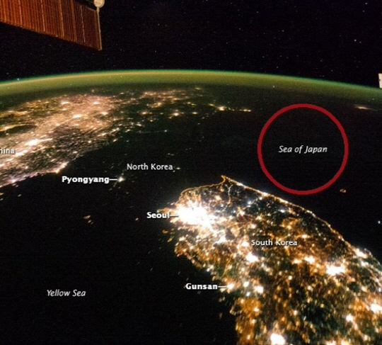 우주정거장에서 찍은 한반도 밤 사진은 나사 공식 사진임에도 불구하고 '일본해(Sea of Japan)'가 선명하게 새겨져있어 안타까움을 자아낸다. 나사 홈페이지에 올라온 수많은 위성사진 중 동해가 일본해과 병기된 사진은 찾기 어려운 현실이다. 나사는 물론 유네스코, 세계기상기구(WMO), 영국 언론 BBC 등도 '일본해' 표기를 따르고 있다.