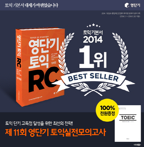 특히, 영단기는 <영단기 토익RC> 2014년 베스트셀러 1위 선정을 기념해 모든 구매자에게 '제11회 영단기 토익실전모의고사'를 100% 무료로 증정 한다. 영단기의 토익실전모의고사는 토익 시험의 최신 경향을 완벽히 분석하고 반영해, 토익커들 사이에서 싱크로율이 높은 모의고사로 주목 받고 있다.