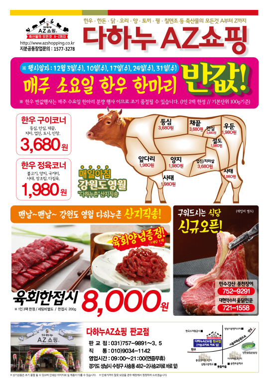 축산물종합쇼핑센터 다하누 'AZ쇼핑' (www.azshopping.co.kr 대표 최계경) 에서는 연말연시를 맞아 고객들을 위한 할인 혜택을 준비했다.