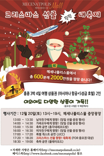 서울 합정역 쇼핑문화공간 '메세나폴리스몰' (http://mecenatpolismall.co.kr/) 에서는 12월 20일에 크리스마스 맞이 경품 행사를 진행한다. 이 '크리스마스 선물 팡팡 대축제'는 메세나폴리스몰에서 상품을 구매한 고객이면 누구나 참여할 수 있다. 추첨행사를 통해 1등에게 홍콩 3박4일 여행상품권(2인, 아시아나항공+5성급호텔)을 지급하며 그 밖에도 200만원 상당의 엘리시안강촌 스키여행권, 로라애슐리 130만원 상당의 침대 등 총 600명에게 2천만원 상당의 다양한 선물을 증정한다. 추첨은 12월 20일 오후 5시에 메세나폴리스몰 지하 1층 중앙광장에서 진행될 예정이며 오후1시부터 5시까지는 사전 행사로 당일 방문 고객에게도 다양한 경품을 지급한다. 또 경품 추첨에 앞서 5인조 남성 아이돌"JJCC" 의 공연을 비롯하여 방문객을 위한 선물증정 게임, 홍대 인디밴드 플레이모드와 총각네레코드방의 공연 등을 통해 다양한 재밋거리와 볼거리를 선사할 전망이다.