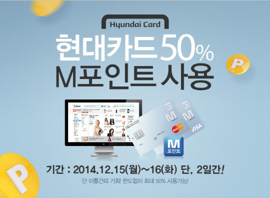 CJ오쇼핑이 운영하는 온라인몰 CJ몰(www.CJmall.com)이 현대카드와 함께 16일까지 구매금액의 50%를 현대카드 M포인트로 결제할 수 있는 특별 프로모션을 실시한다.