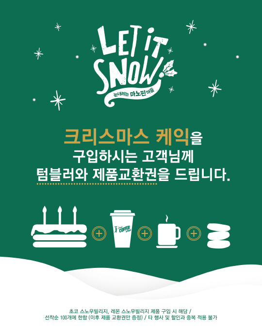 또한 마노핀은 크리스마스 시즌 케익 구매 고객을 대상으로 마노핀 텀블러와 제품교환권(호호잉글리쉬머핀(오리지널)&라떼)을 증정해 풍성한 크리스마스를 준비했다.