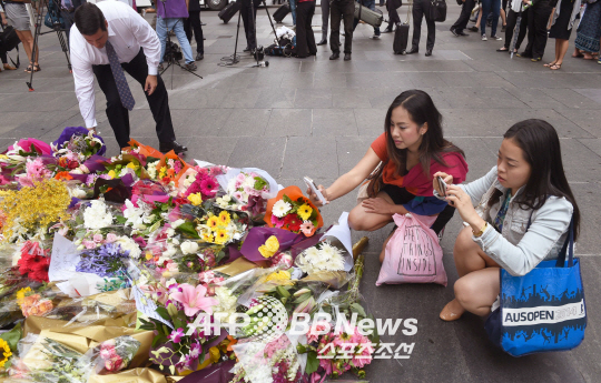 시드니 인질극 종료된 현장엔 사망한 인질을 애도하는 꽃다발이 놓여 있다. ⓒAFPBBNews = News1