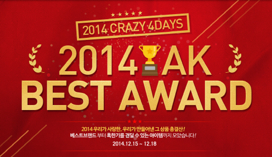 온라인쇼핑몰 AK몰(www.akmall.com)은 12월18일까지 '2014 AK몰 베스트 어워드'를 진행한다.