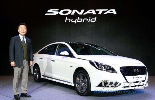 현대차가 16일 서울 강남의 그랜드 인터콘티넨탈 호텔에서 '신형 쏘나타 하이브리드' 발표회를 가졌다. 곽 진 부사장이 신형 쏘나타 하이브리드 옆에서 포즈를 취하고 있다. 사진제공=현대자동차