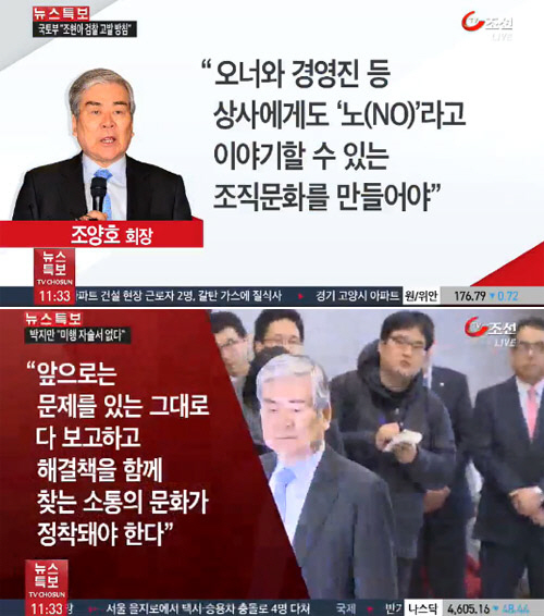 이날 회의에서 조 회장은 "오너와 경영진 등 상사에게도 '노(NO)'라고 이야기할 수 있는 조직 문화를 만들어야 한다"면서 "앞으로는 문제를 있는 그대로 다 보고하고 해결책을 함께 찾는 소통의 문화가 정착돼야 한다"고 말한 것으로 알려졌다.